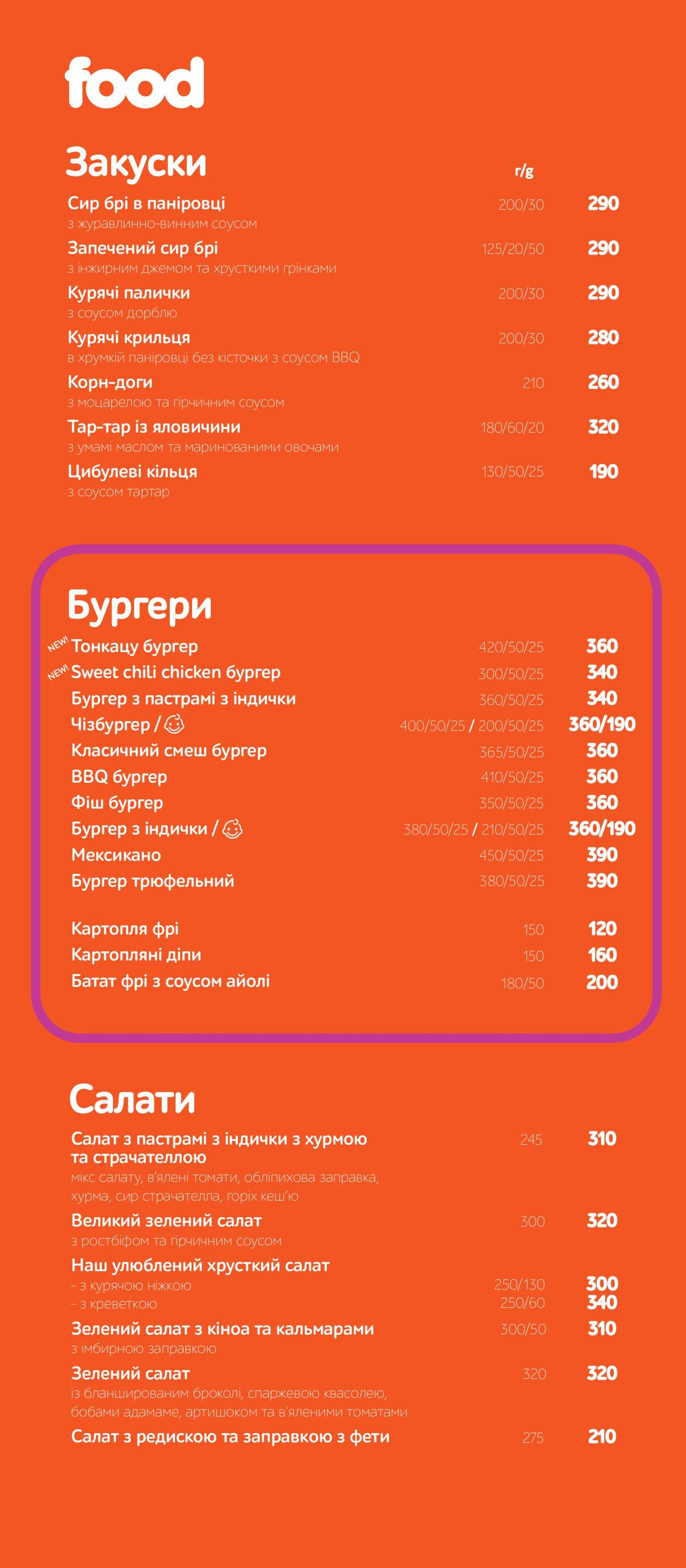 Ми не fast food, проте іноді можемо стати cheat meal. Подаємо 12 різновидів класичних та авторських бургерів: чізбургер, фішбургер, BBQ бургер, трюфельний, смеш бургер, вегабургер, бургер з індички, мексикано та інші.