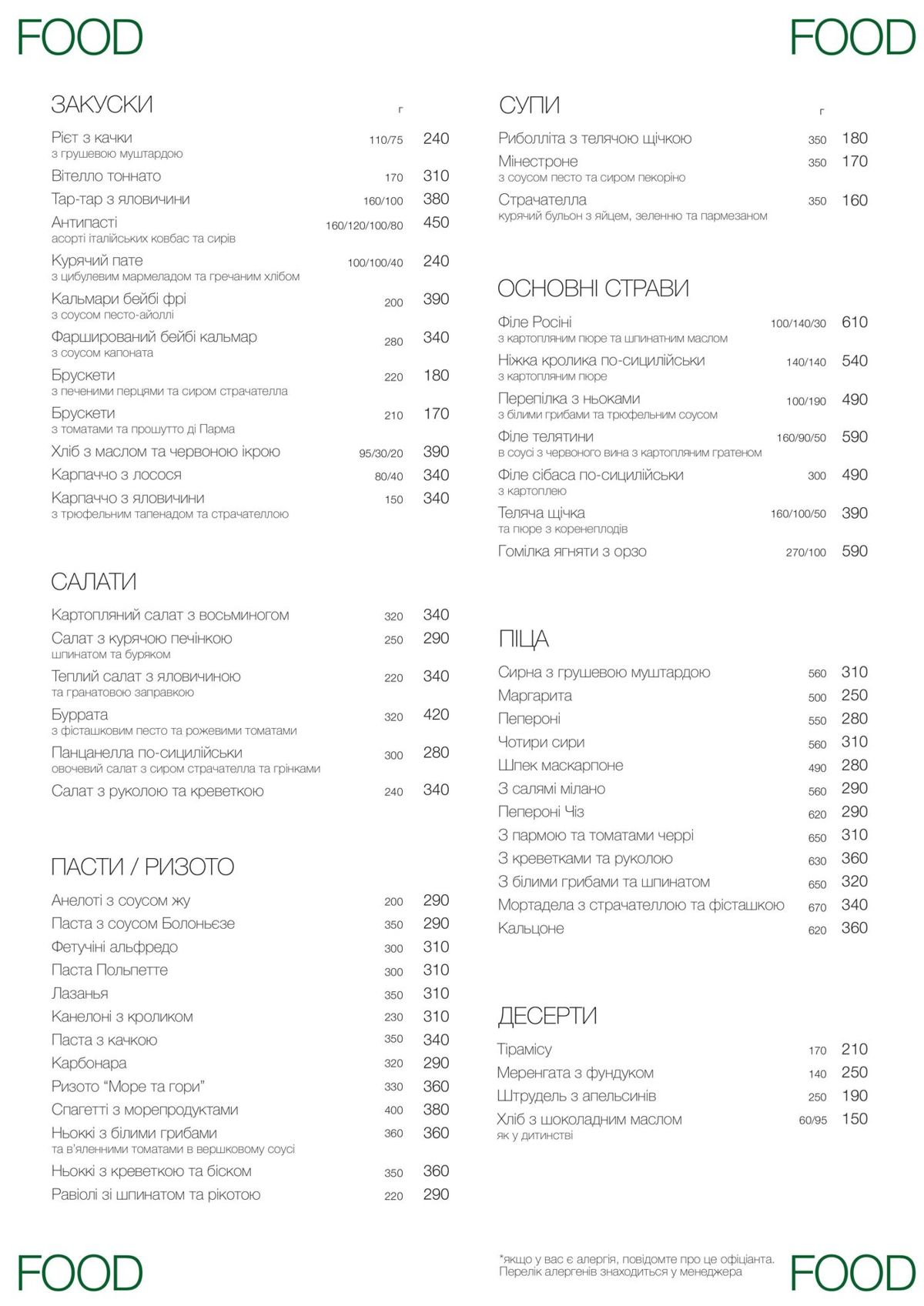 Італійська кухня — одна з найважливіших на мапі світової гастрономії. Готуємо у дровʼній печі, аби італійські традиційні страви, здорове ставлення до їжі та сучасне бачення обʼєднались в єдиному просторі.