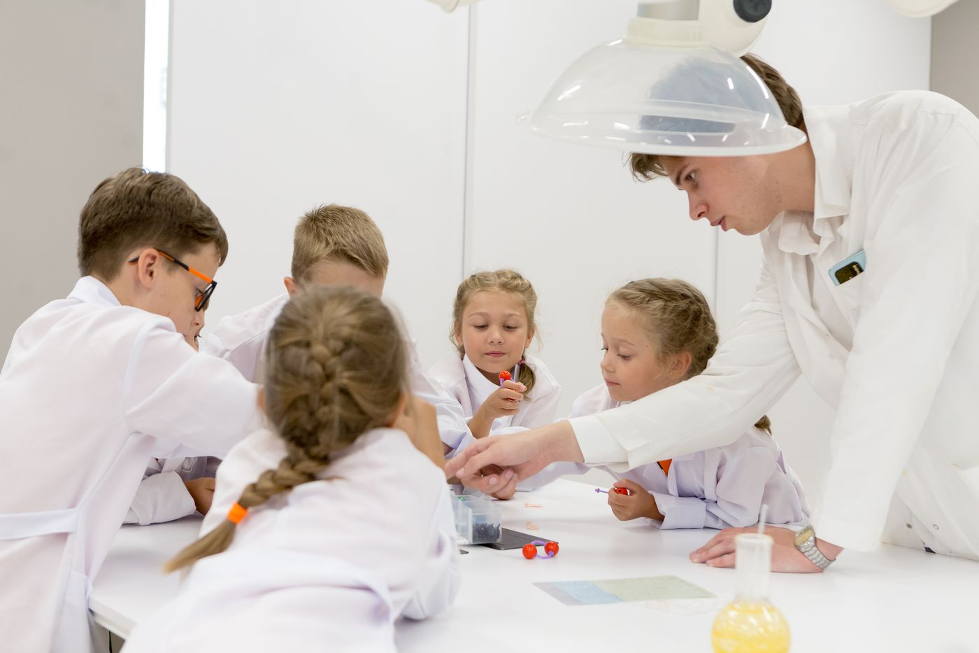 На наших заняттях діти зануряться у світ молекул та хімічних реакцій, де дізнаються про основні наукові поняття, агрегатні стани речовин та їхні зміни. Вони самостійно проводитимуть хімічні експерименти, спостерігатимуть фізичні та хімічні явища та навіть створять власний активний вулкан!